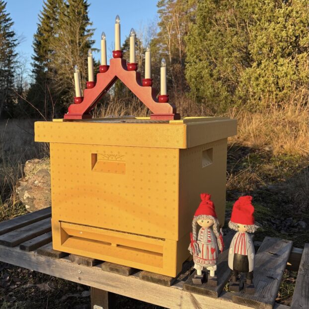 I morse vaknade vi till en stjärnklar himmel denna årets mörkaste dag. Nu går det mot ljusare tider igen och bina väntar på nästa säsong i sina ombonade kupor. Några kanske har julpyntat?